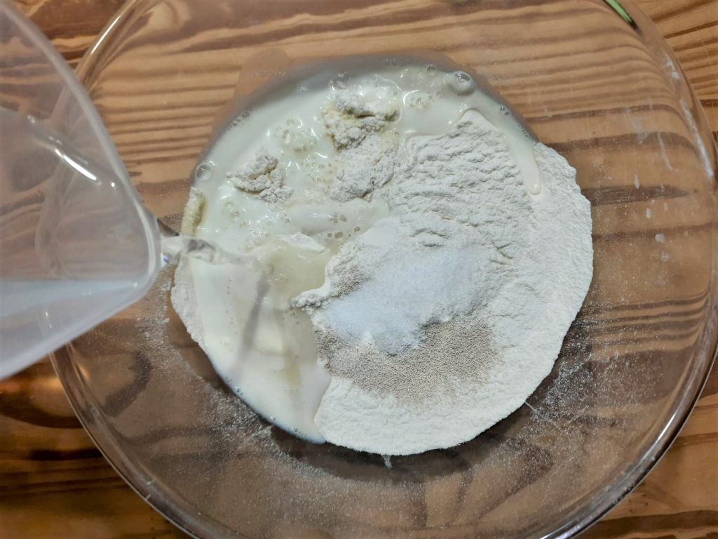 En un bol mezclar las dos harinas, la levadura deshidratada y el azúcar. Añadir la leche, el aceite y parte del agua y comenzar a amasar.