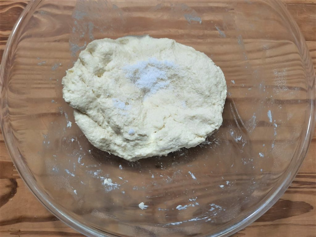 Una vez añadida toda el agua, trabajar durante unos minutos y luego agregar la sal.