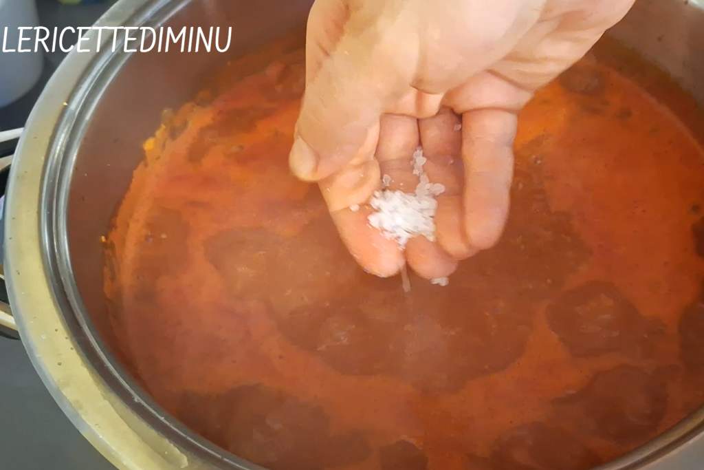 Bajar el fuego y, trasladando la cacerola al quemador más pequeño, mantener el fuego al mínimo y cocinar con la tapa entreabierta durante unas 2 horas y media.
