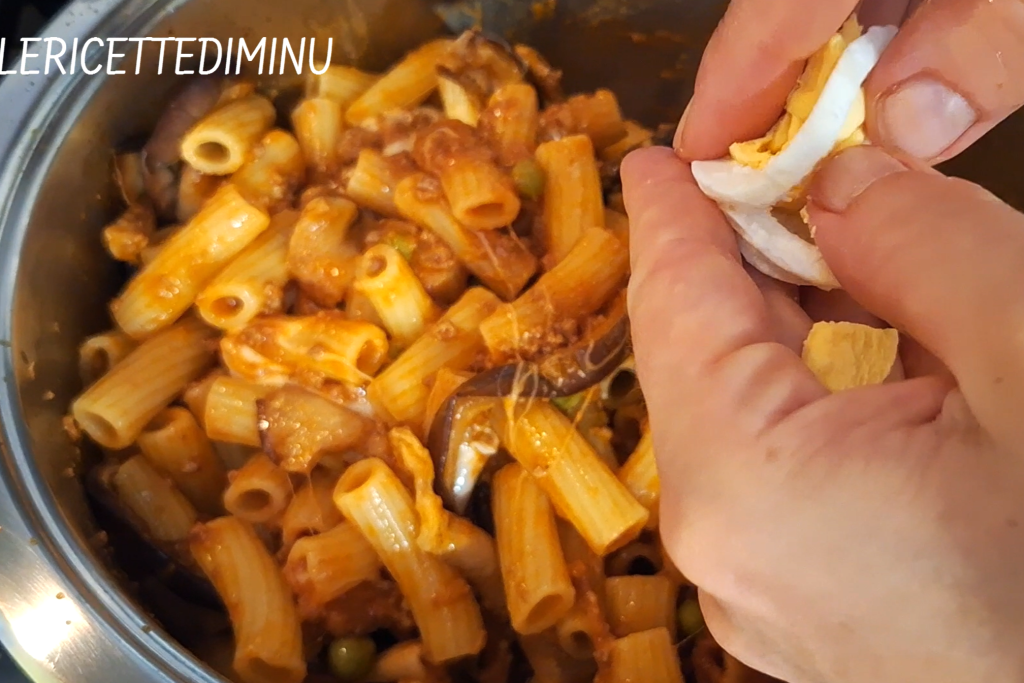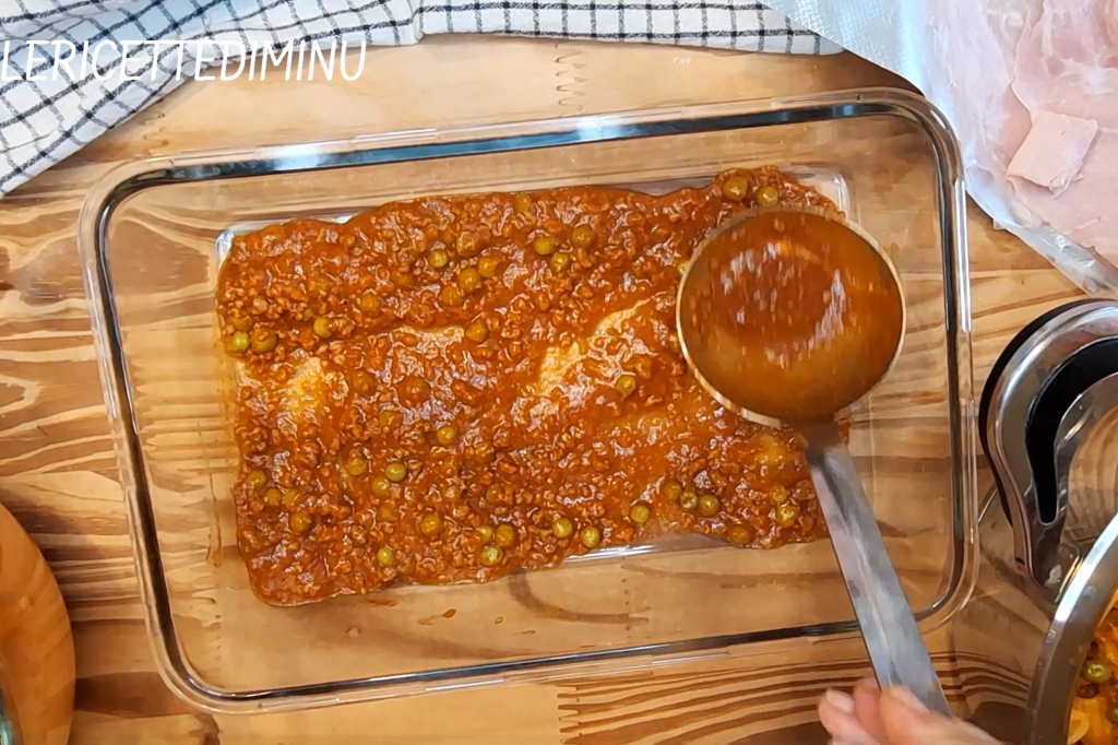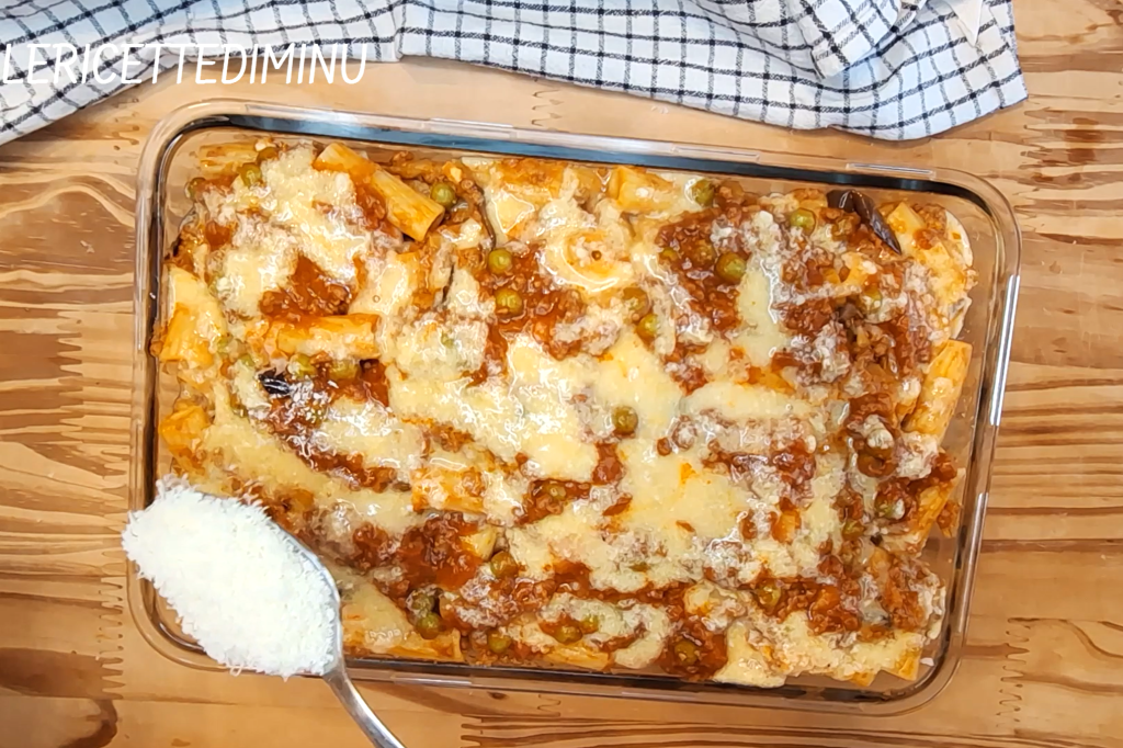 Hecha con ingredientes sabrosos, gusta a grandes y pequeños: la pasta se condimenta con un buen ragú con guisantes; luego, el queso, los huevos, el jamón y las berenjenas fritas enriquecen aún más el plato de sabores.