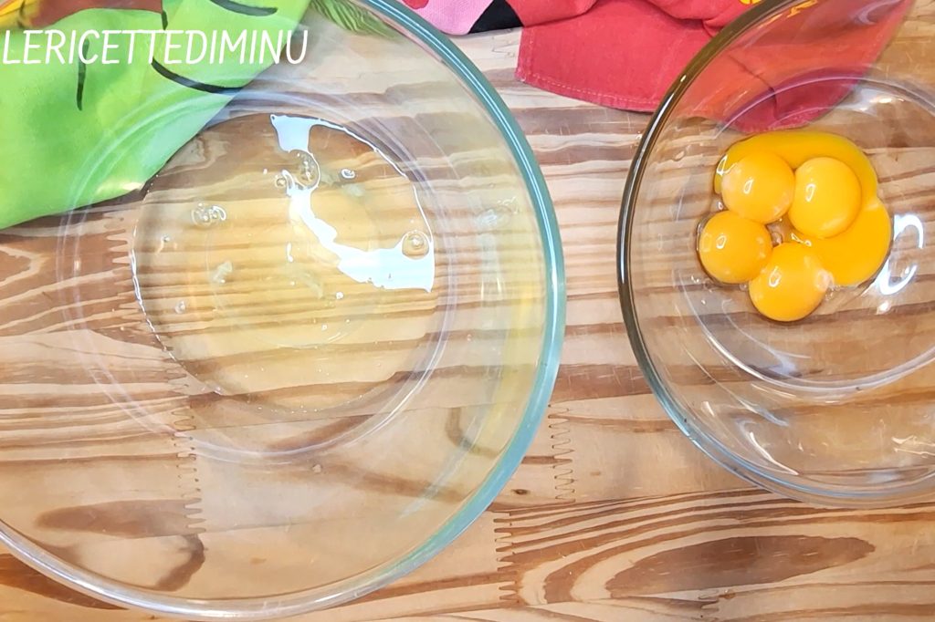 • Con la ayuda de las batidoras eléctricas, monta las claras a punto de nieve y aparte, bate las yemas con el azúcar y la vainillina.