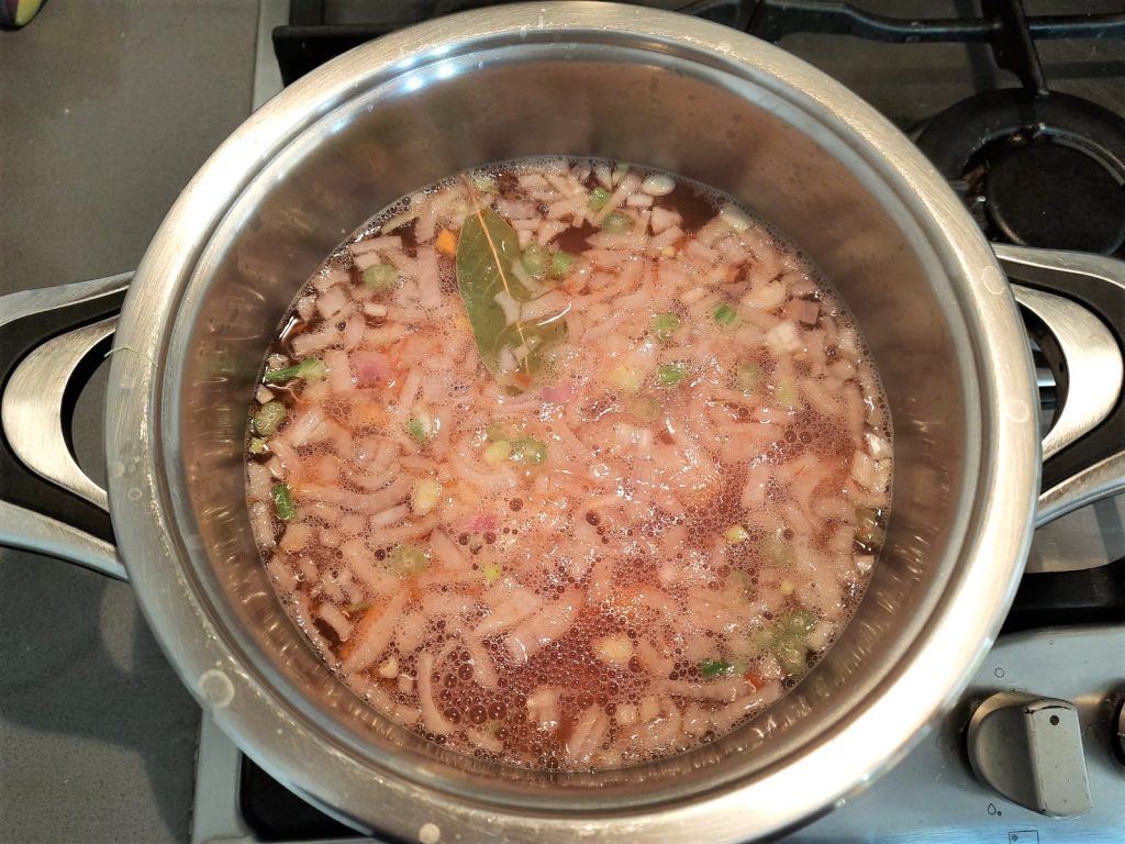 Subir el fuego para que el caldo vuelva a hervir, luego cocinar a fuego lento cubriendo con la tapa.