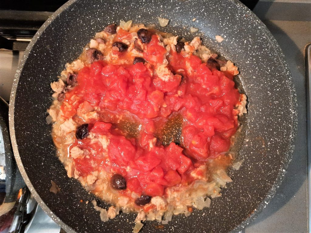 Cuando hierva, sala moderadamente teniendo en cuenta que el atún y las aceitunas ya aportarán un poco de sal a la salsa. Baja entonces el fuego y cocina tapando con una tapa durante unos diez minutos.