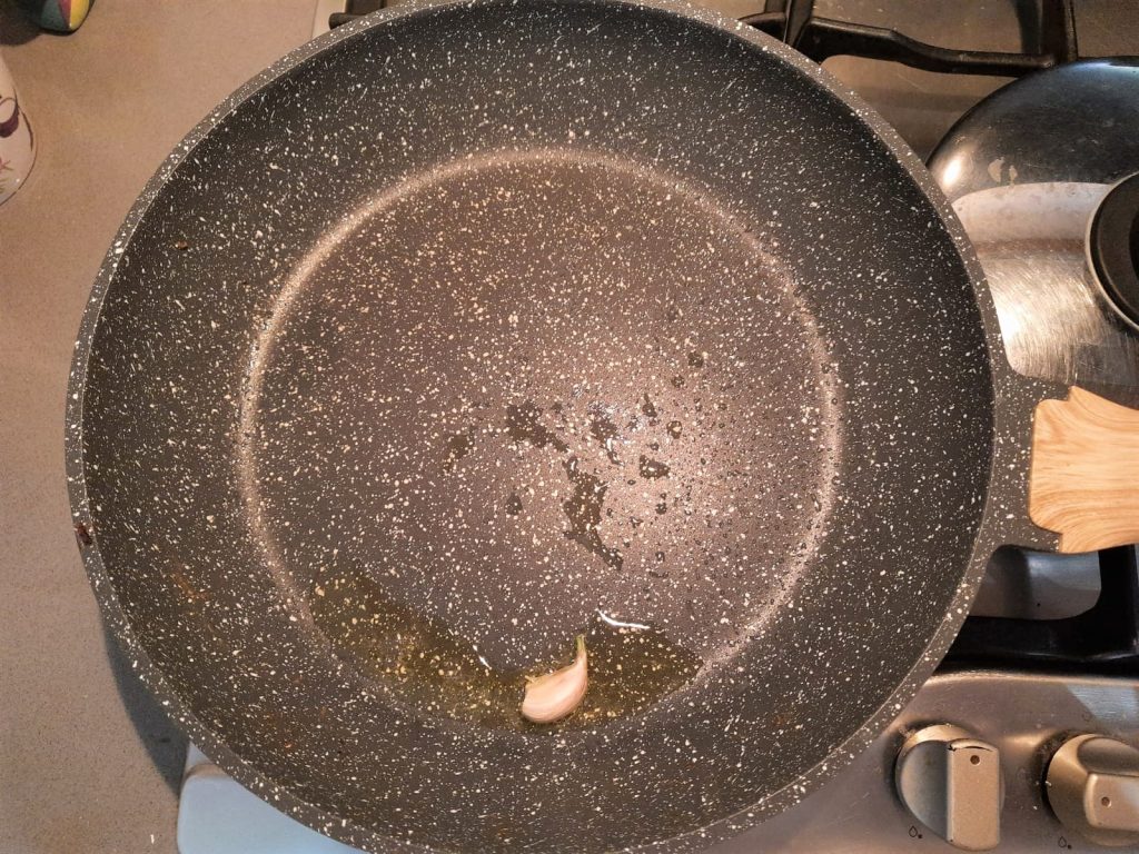 En una sartén amplia, fríe un diente de ajo grande entero en unas 4 cucharadas de aceite, inclinando ligeramente la sartén.
