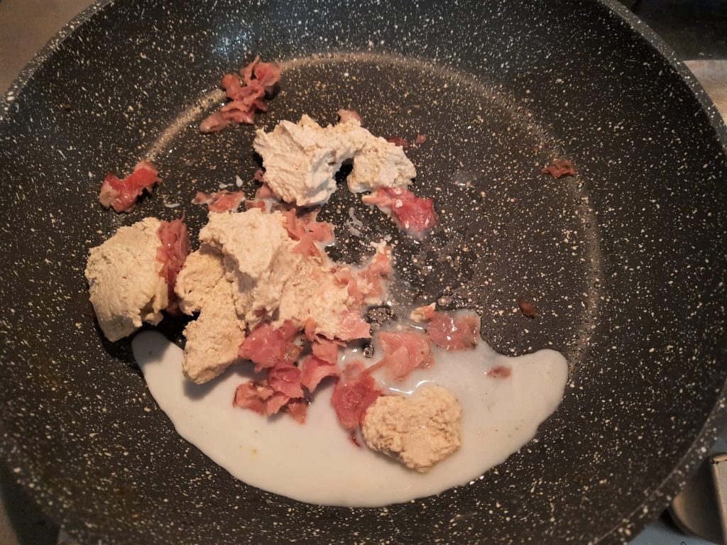 Cuando el jamón esté dorado pero no seco, vierte la leche en la sartén y apaga el fuego.