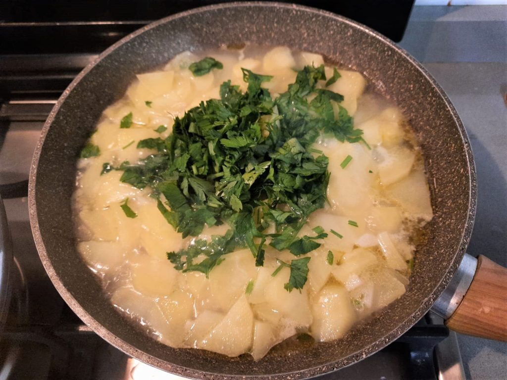 En una sartén grande antiadherente verter el aceite de oliva y añadir el ajo picado, las patatas en rodajas, el perejil picado y 350 ml de agua (aproximadamente un vaso y medio grande), llevar a ebullición a fuego vivo.