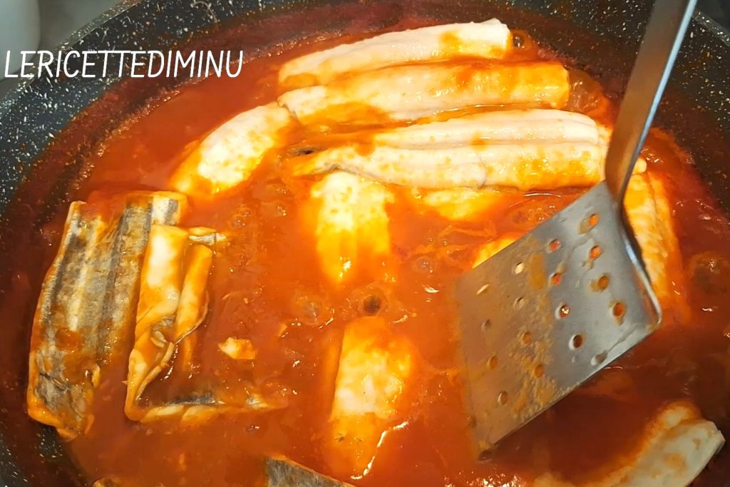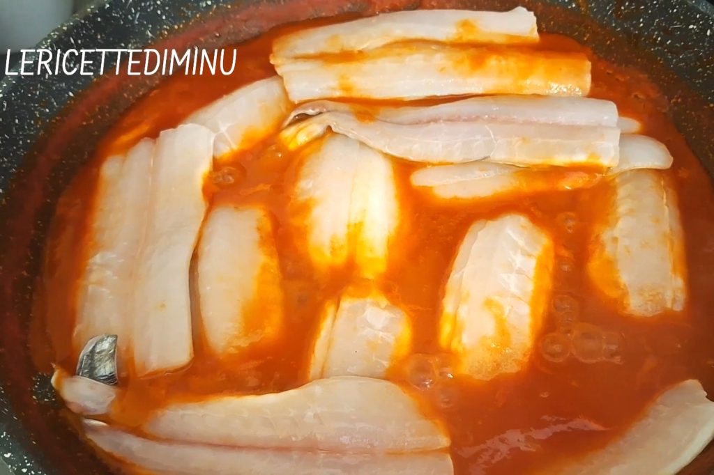 • Colocar en la salsa obtenida, los filetes de pez sable distribuyéndolos uniformemente con el lado de la piel hacia abajo.