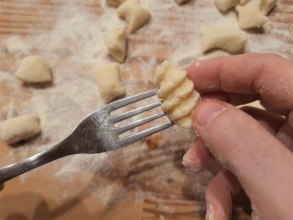 • Pasar los trozos por un poco de harina, aceitar el pulgar y los dientes de un tenedor y proceder a hacer los ñoquis (ver video).