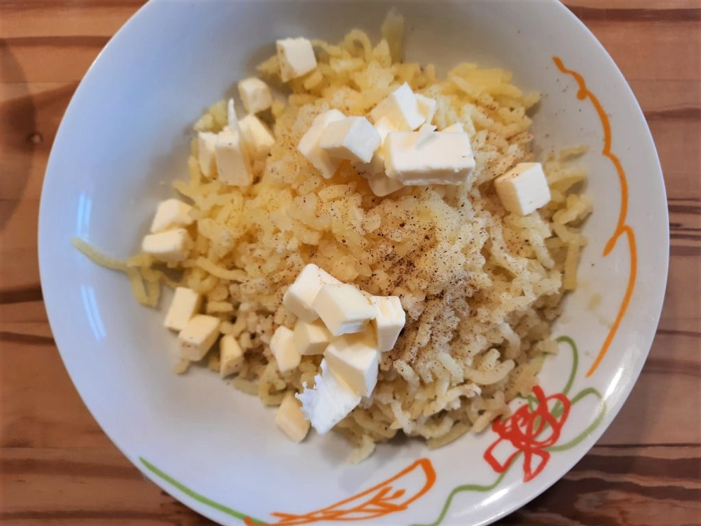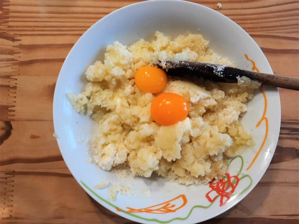 Cuando estén cocidas, pasar las patatas calientes por el prensador de patatas y luego añadir inmediatamente la mantequilla, los aromas, el parmesano o grana rallado, las 2 yemas de huevo.