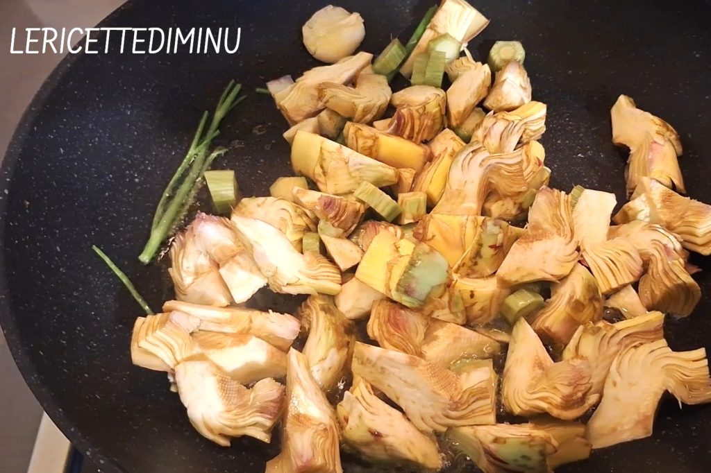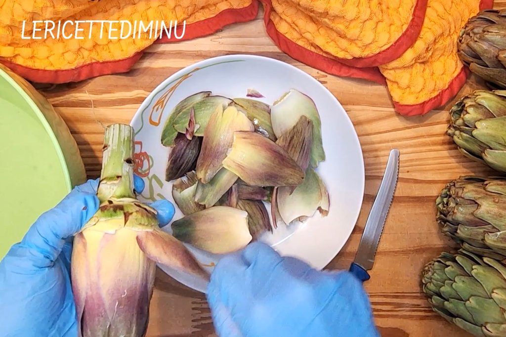 Para preparar la salchicha y alcachofas, limpiar las alcachofas eliminando las hojas externas más duras y la parte dura del tallo.