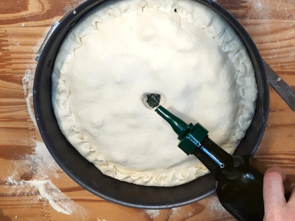 Sellar bien los bordes, crear una salida de aire en la superficie y verter unas gotas más de aceite.