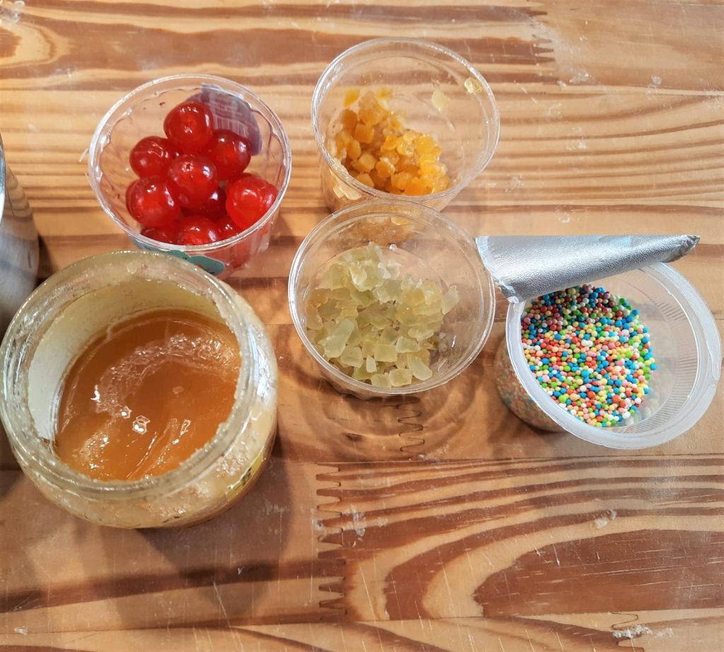 Apaga el fuego y añade las frutas confitadas: cidra, naranja y cerezas cortadas por la mitad.