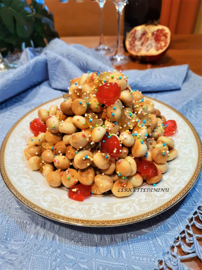 Vierte la mitad sobre los struffoli horneados colocados en un bol, añade el diablillo y revuelve.