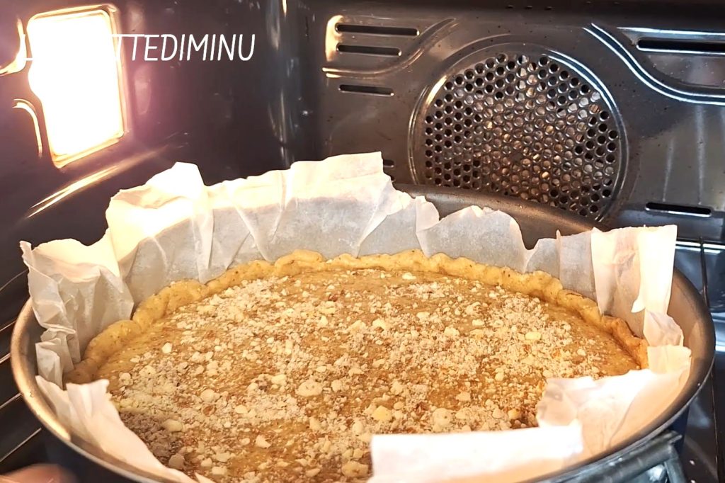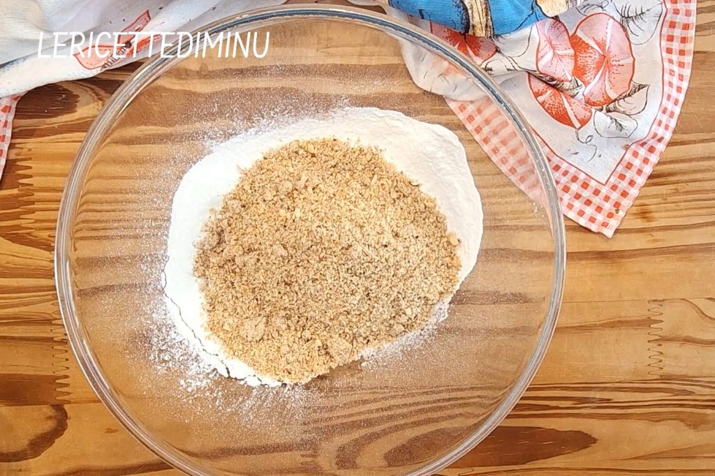 • Amasar juntos la harina 00 y la de avellanas prevista para la masa, el azúcar glas, la mantequilla ablandada en cubitos, medio cucharadita de esencia de vainilla, la levadura, la sal fina y medio huevo batido.