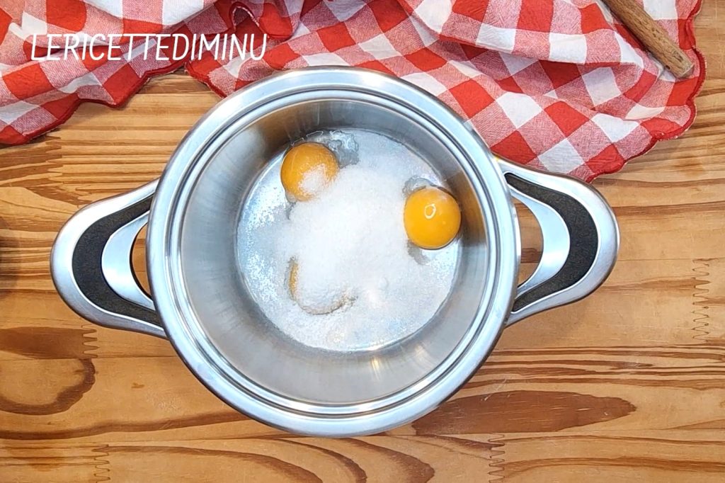 Mientras tanto, preparar la crema trabajando el azúcar, la vainilla y las yemas directamente en la cacerola donde espesarás la crema.
