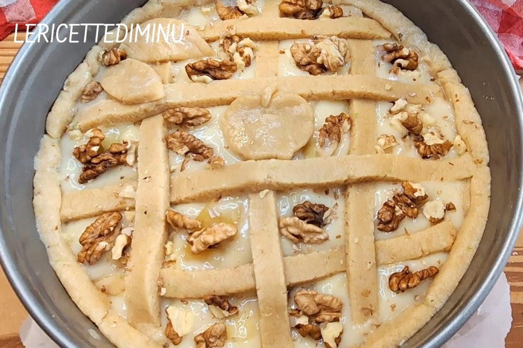 La tarta de manzana con crema y nueces está lista