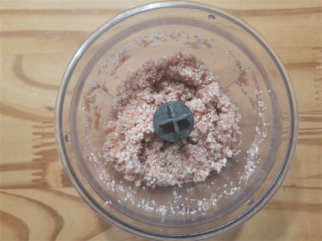 En el mezclador, triturar la carne con el jamón curado.