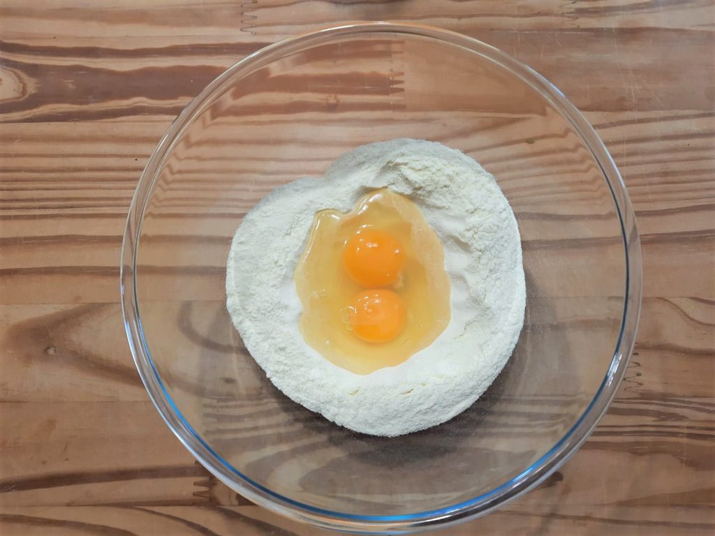 Amasar la harina 00 y 2 huevos medianos, haciendo un volcán y rompiendo los huevos en el centro.