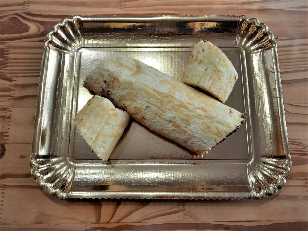 Enrollar de manera no excesivamente apretada y esperar unos minutos, lo suficiente para que la Nutella no gotee más.