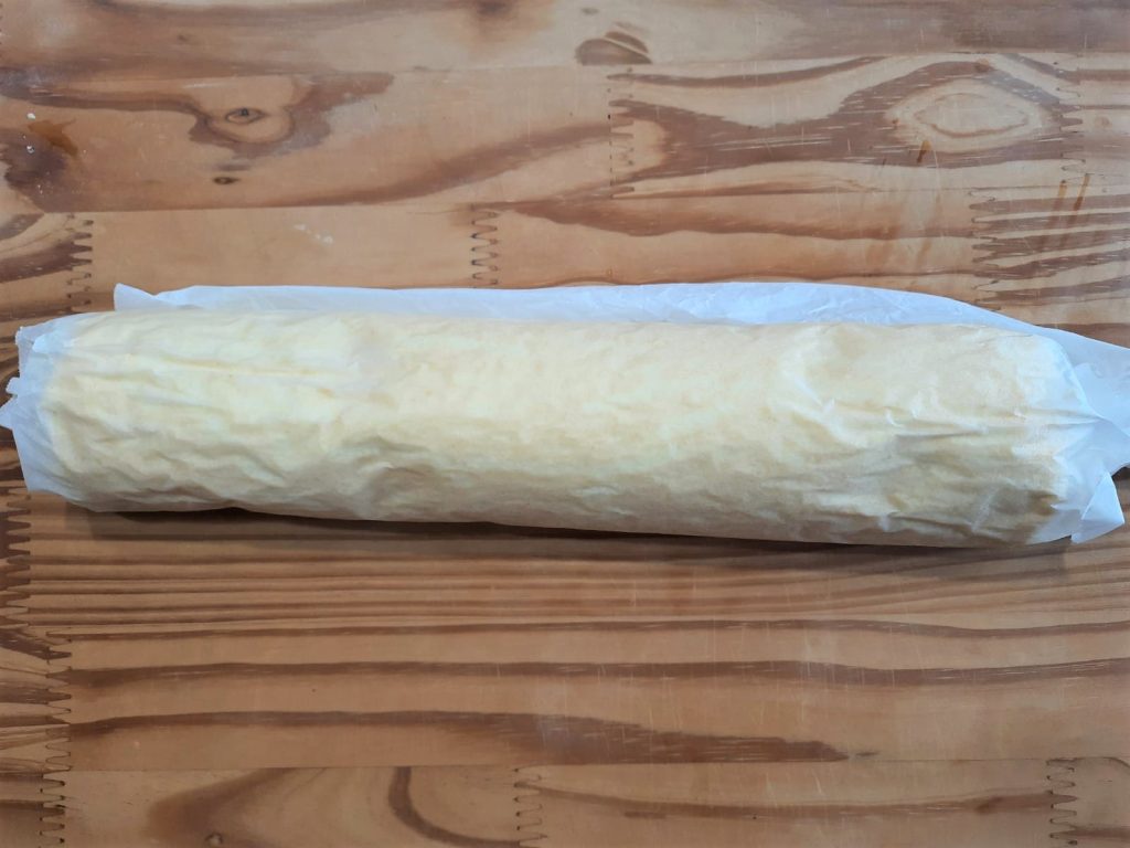 Una vez horneado, extender inmediatamente encima otra hoja de papel de horno o un trapo humedecido que no huela a detergente y enrollar, dejándolo así hasta que se enfríe completamente.