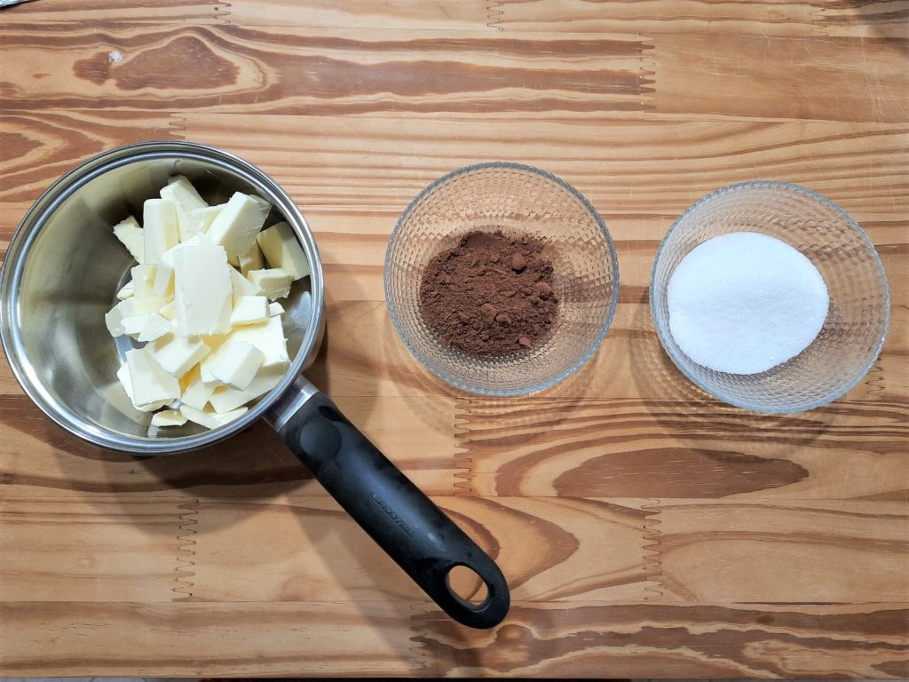 Derretir suavemente la mantequilla a fuego muy bajo, retirar del fuego. Luego añadir el azúcar glas y el cacao y mezclar.