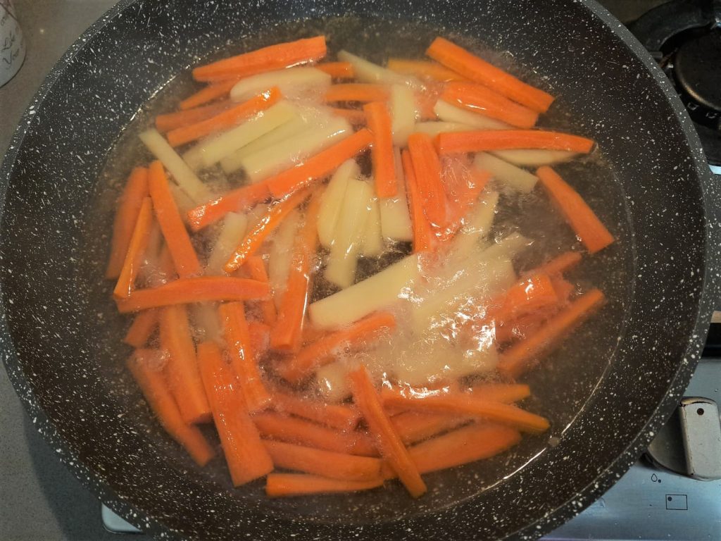 Cuando hierva, salar ligeramente y añadir los bastones de zanahorias y patatas.