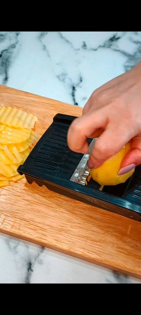 Preparad las chips de patatas en freidora de aire lavando bien las patatas y pelándolas con un pelador de patatas. Para una versión rústica, también podéis dejar la piel.