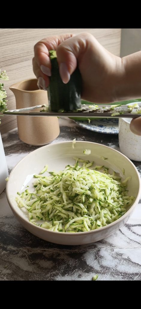 Rallad el calabacín con un rallador de agujeros grandes, añadid un pellizco de sal y dejadlo reposar alrededor de 10 minutos. Transcurrido ese tiempo, escurridlo muy bien con las manos o con un paño limpio para eliminar toda el agua sobrante.