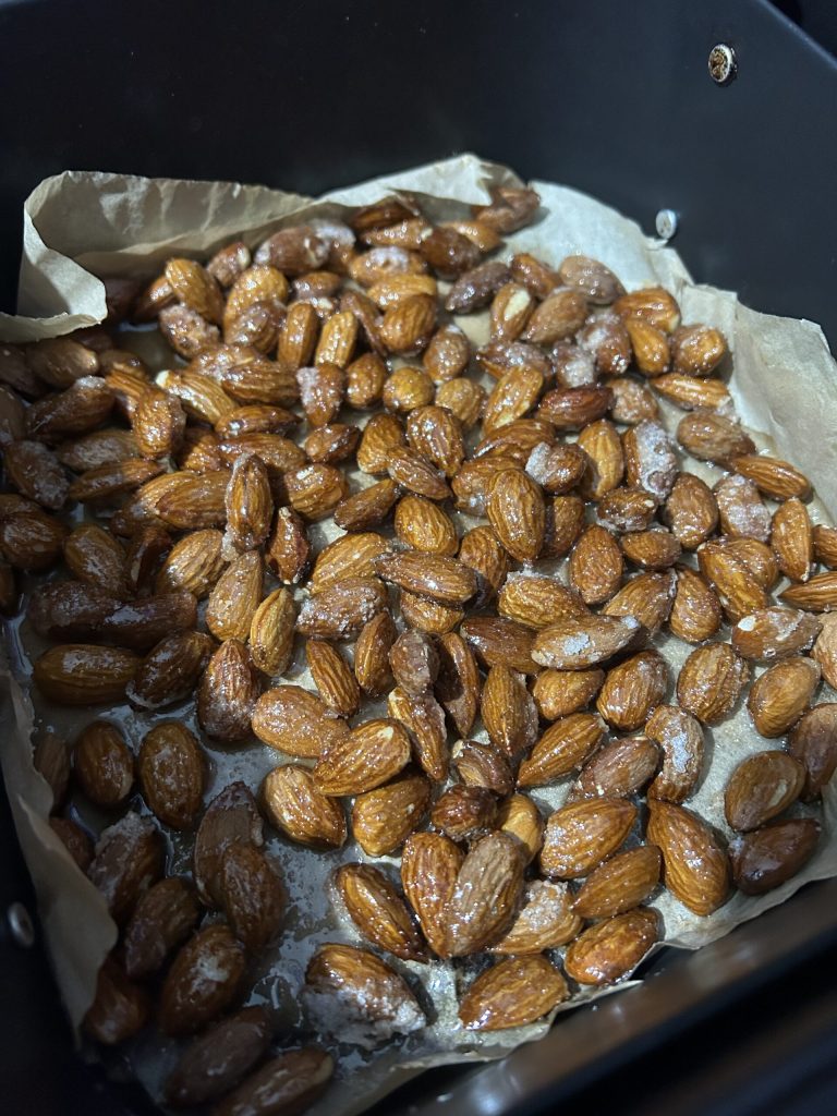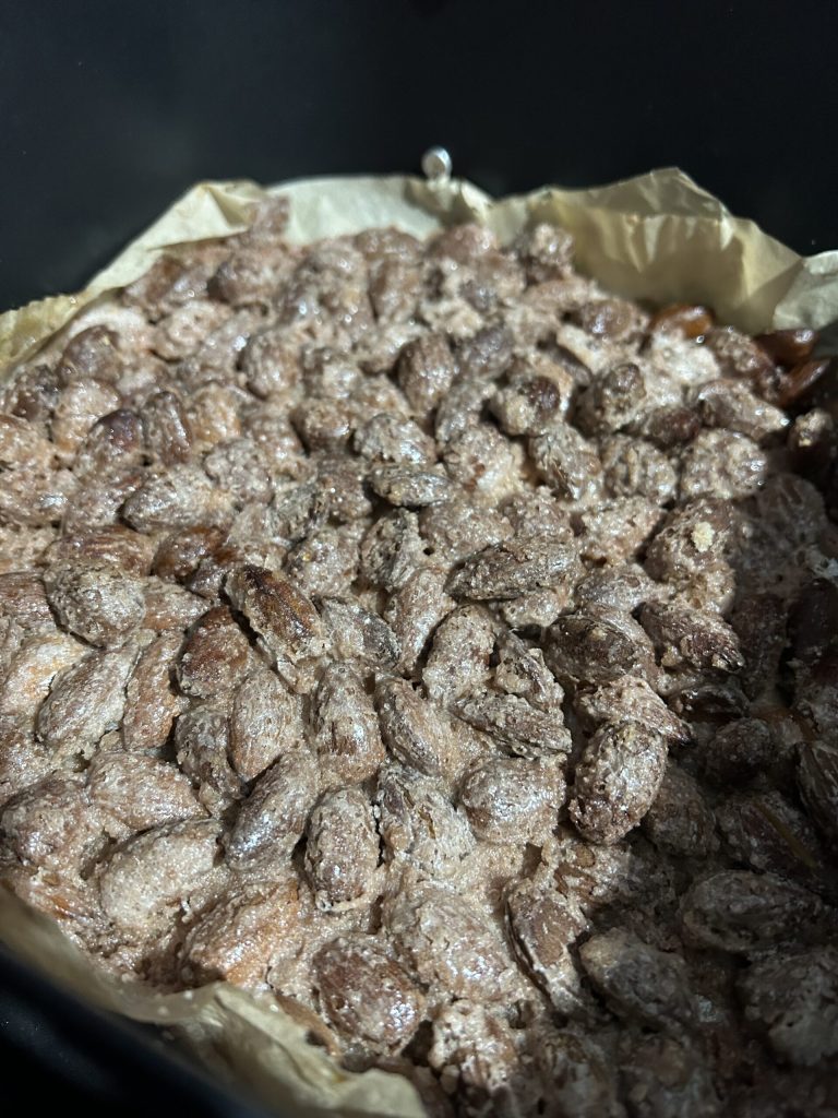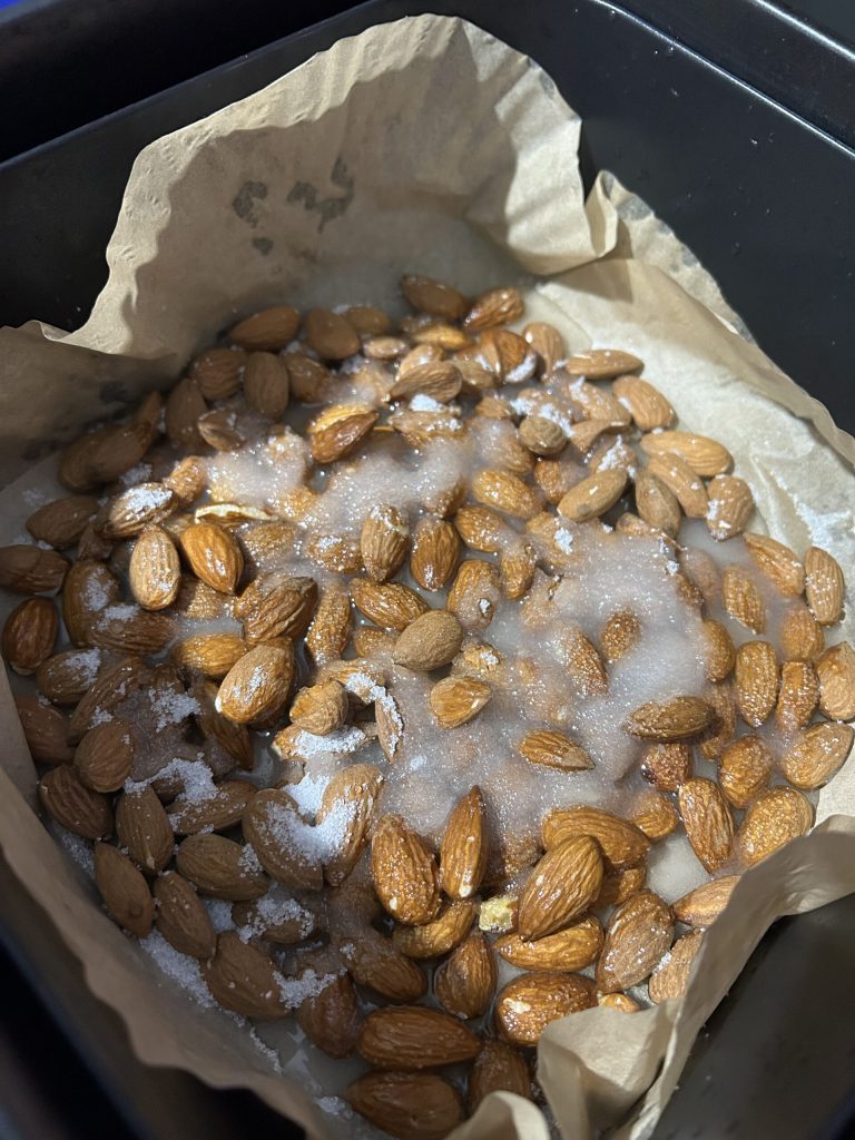 Forra la cesta de la freidora de aire con un papel de horno: sirve para evitar que el azúcar y el agua caigan debajo de la rejilla. Sin embargo, la rejilla sigue siendo fundamental, porque permite que el aire circule también por debajo y las almendras se tuesten mucho mejor.
