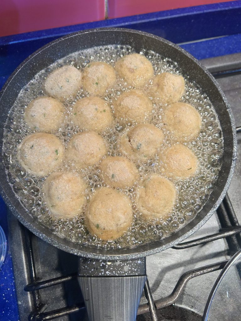 • Cuando hayas preparado la mayoría de las albondiguitas, pon a calentar el aceite de semillas para freír, yo uso una sartén de piedra no demasiado grande pero de bordes altos, así la cocción será más homogénea y rápida. Cuando el aceite esté bien caliente, comienza a freír las albóndigas. Puedes asegurarte de que el aceite está caliente sumergiendo la punta de un palillo en el aceite. Si ves que se forman burbujas de aceite alrededor del palillo, el aceite ha alcanzado la temperatura correcta, de lo contrario espera. Para una buena fritura seca, el aceite debe haber alcanzado la temperatura adecuada y debe mantenerla durante la cocción. Yo uso una tapa durante la cocción y una llama viva.