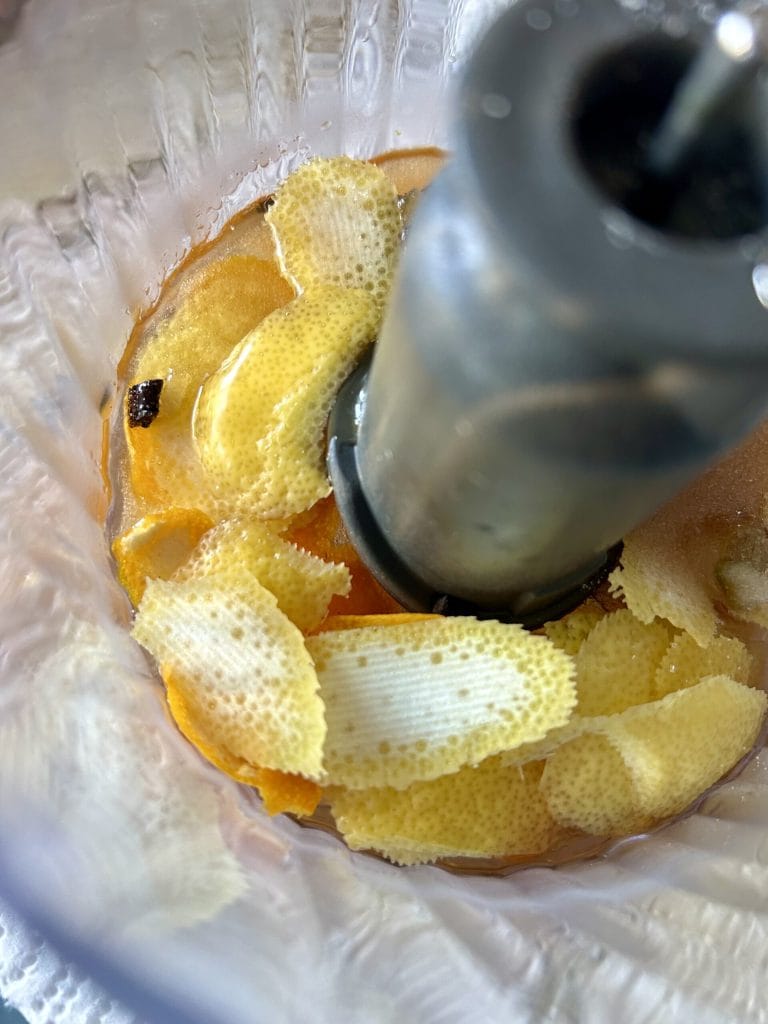 Pon en la picadora la cáscara de la naranja, la cáscara del limón, la miel, el azúcar, el Marsala y el aroma de vainilla (o las semillas de 1/4 de vaina).