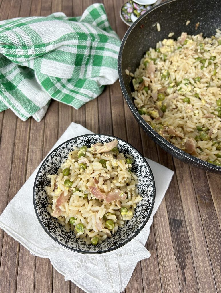Mi arroz cantonés para vaciar la nevera se parece mucho a la receta original y contiene los ingredientes básicos, es fácil de preparar y es apreciado en la familia porque, obviamente, se asemeja mucho a nuestra cocina. Mi necesidad surgió después de haber preparado el pastel de arroz, aún quedaba un exceso de arroz cocido y, dado que en la cocina no se debe tirar nada, preparé este arroz salteado.