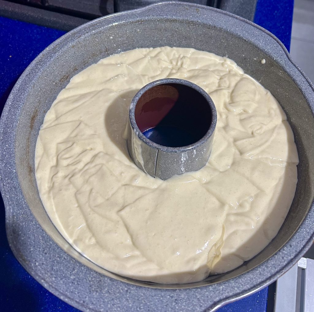 • Vierto la masa en el molde para bizcocho de 26 cm, bien enmantecado y enharinado.