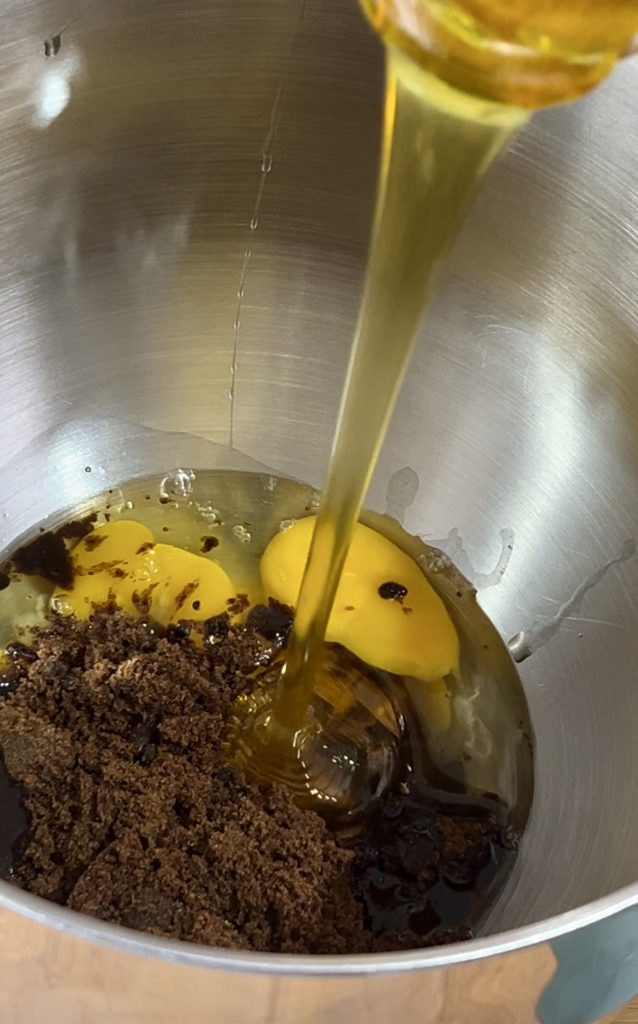 Pon los huevos, el azúcar y la miel en el bol de la amasadora o en un cuenco y bátelos bien hasta que estén montados. Añade luego, mientras sigues mezclando, el aceite, la leche, la harina, las especias y finalmente el sobre de levadura. Utiliza las batidoras eléctricas para mezclar todo y obtener una mezcla homogénea.