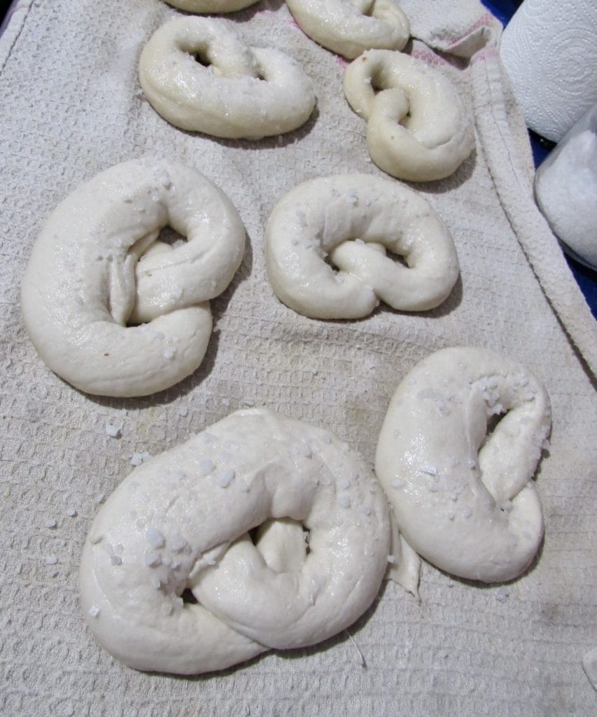 Después del levado, colocar la masa sobre una superficie ligeramente enharinada y dividirla en 10 porciones. Alargar cada porción a mano como ves en la foto en un bastón de unos 40 cm con los extremos más finos que la parte central. Doblar los extremos hacia el centro cruzándolos como ves en la foto en los que he dejado intencionalmente volteados para mostrar el clásico entrelazado del Bretzel. Colocar los bretzel a levar nuevamente cubiertos con un paño y colocarlos todos con el entrelazado apoyado sobre la superficie de trabajo, para que no se abran luego en la cocción.