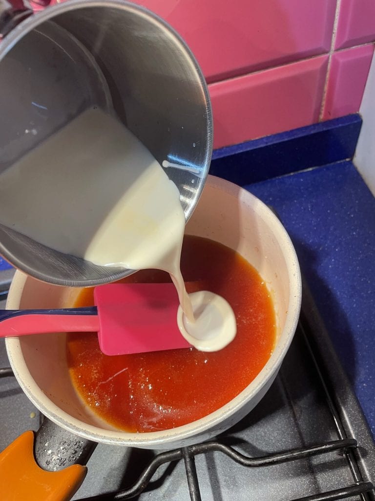 • Poned todo el azúcar previsto para el caramelo en un cazo antiadherente y llevad el cazo a fuego medio. Mientras el azúcar se derrite, calentad la nata en el fogón o como sugiero yo, en el microondas. Calentadla hasta que alcance el punto de ebullición. Cuando el azúcar esté completamente derretido y comience a dorarse, apagáis el fuego y añadís la nata caliente. Podéis remover ligeramente el azúcar mientras se derrite para que no se pegue, pero tened cuidado de no removerlo fuerte porque se enfría y se espesa. La nata debe estar bien caliente cuando la unáis.
