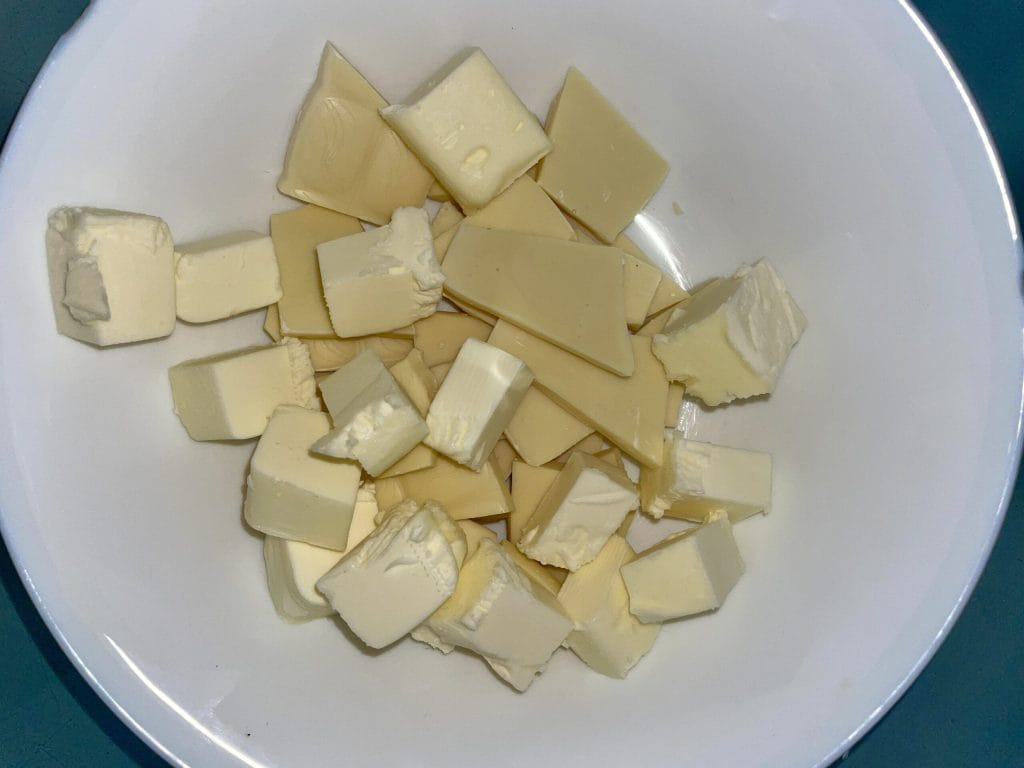 Rompe en un bol el chocolate blanco necesario para la masa junto con la mantequilla y derrítelos en el microondas o al baño maría. Si usas el microondas, recuerda apagar y revolver bien cada 30″ aproximadamente; verás que se derretirá todo muy bien y sin quemarse.