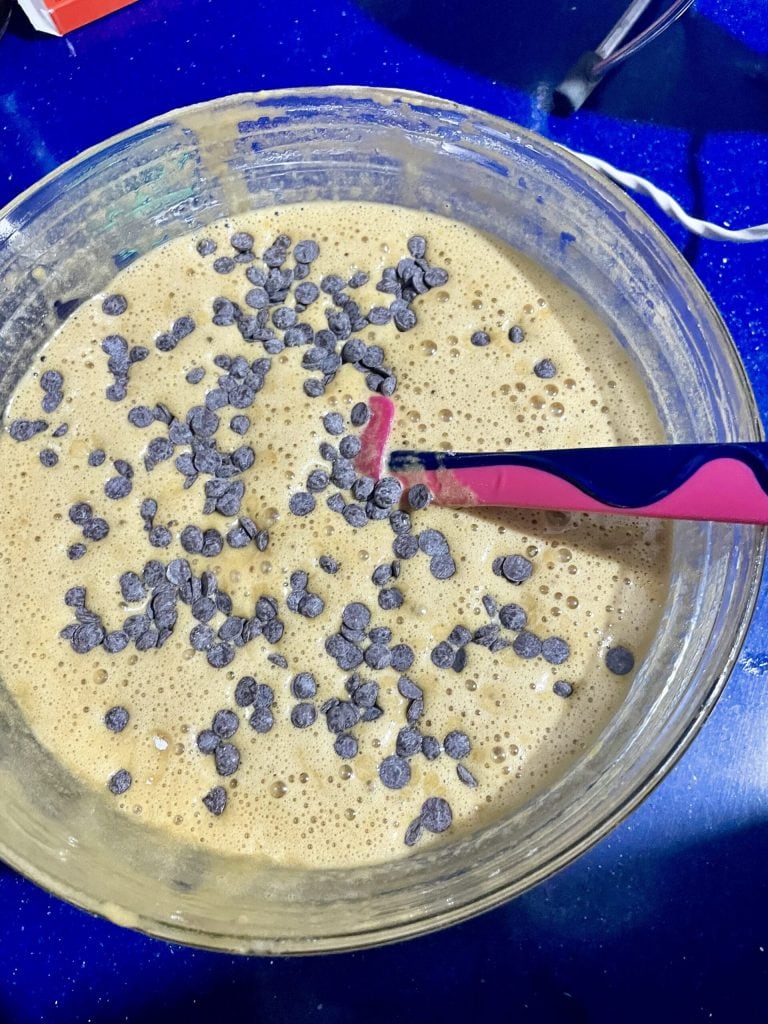 Finalmente, sigue agregando a mano y teniendo cuidado de no desmontar la masa, las gotas de chocolate y el aroma de vainilla.
