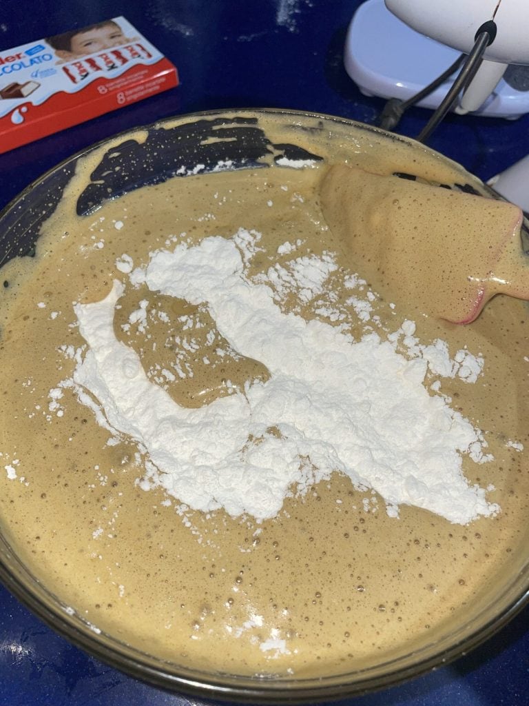 Mi hija, que adora reproducir las recetas que encuentra en los vídeos americanos haciendo cada vez pequeñas modificaciones para realizarlas con ingredientes fácilmente accesibles, ha preparado esta receta que es una buena mezcla entre los dos dulces. La receta original solo incluía chocolate blanco en la masa y 4/5 barritas Kinder como decoración en la superficie, pero al no tenerlas en casa, ella puso 2 barritas y añadió un poco de chocolate blanco en la superficie.