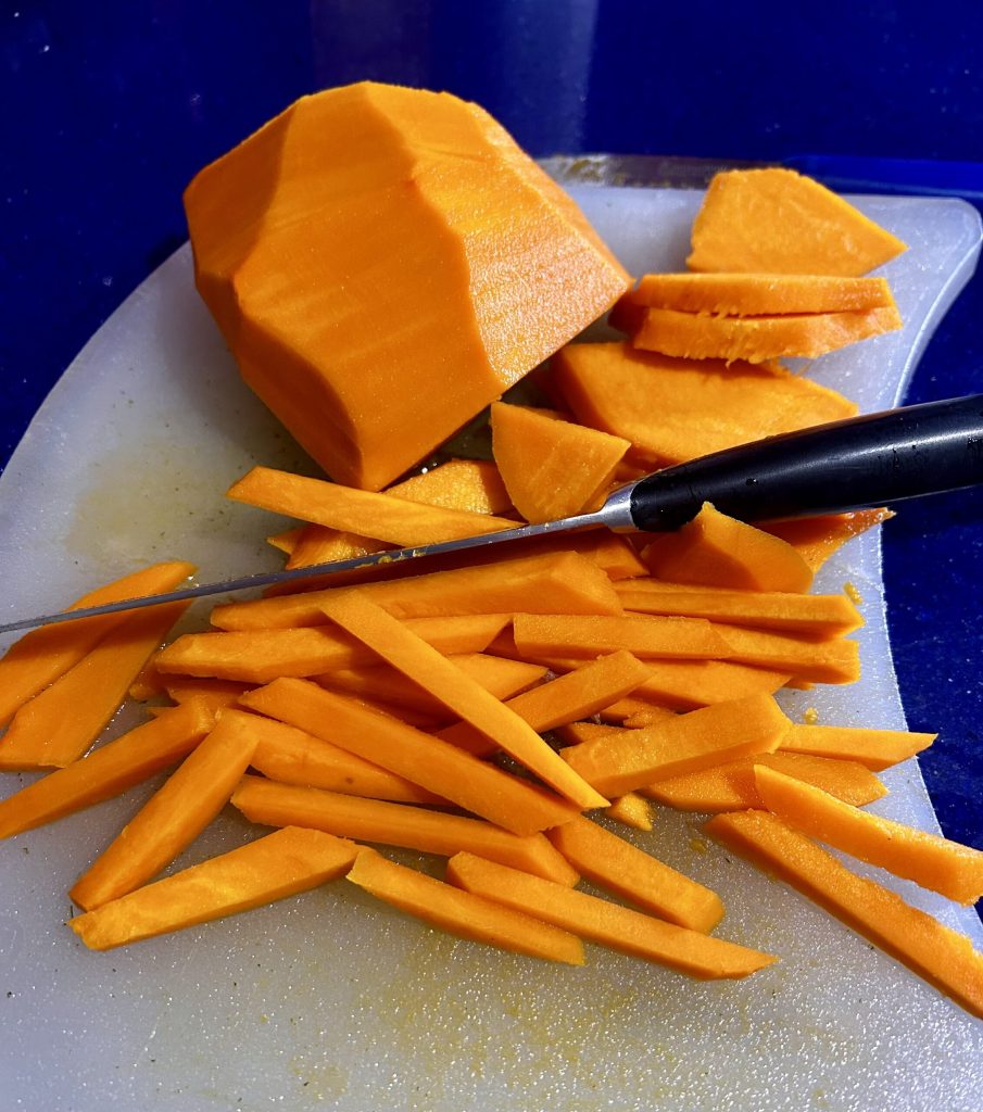 Para preparar estas tiras de calabaza he utilizado la freidora de aire, también os recomiendo un buen cuchillo de cocina de hoja lisa para cortar bien y rápidamente la calabaza.