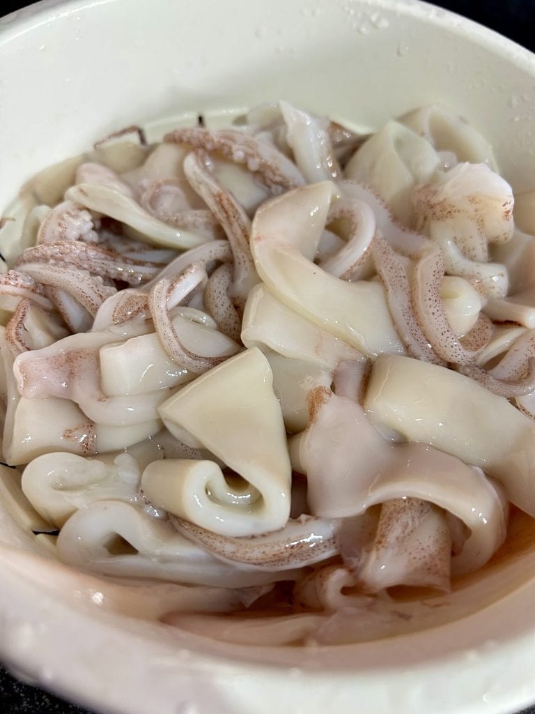 • Para esta receta he utilizado calamares frescos, que requieren un poco de paciencia al limpiarlos. Comencé quitando la piel exterior, tirando de ella suavemente, luego removí las vísceras y el cartílago interno. Una vez limpios, los corté en aros regulares y los enjuagué con abundante agua corriente.