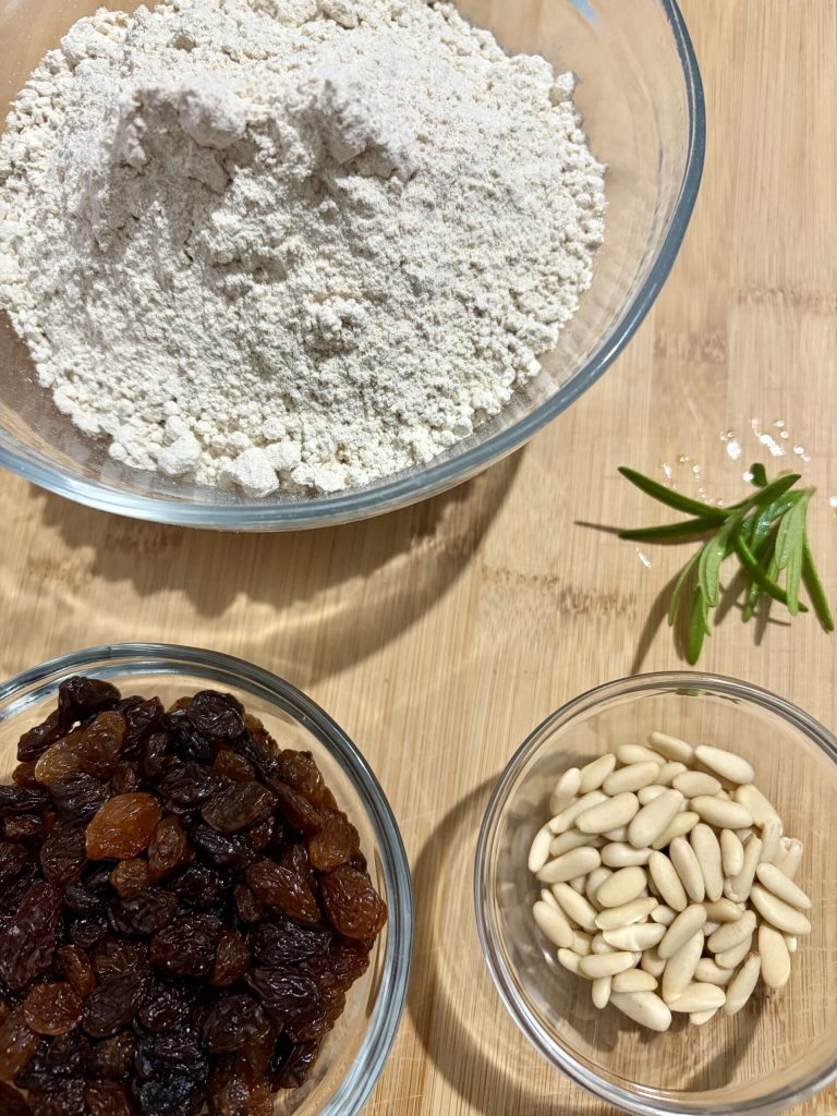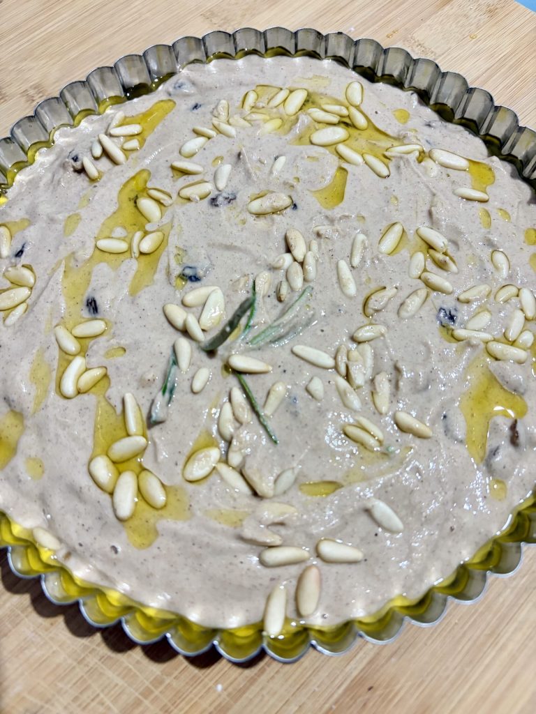 Añade a la harina de castañas una pizca de sal, la ramita de romero y mezcla con un tenedor. Comienza a verter el agua poco a poco, continuando a girar, hasta obtener una masa fluida y sin grumos, similar a una masa de crepas. Luego añade las pasas bien escurridas y los piñones: pon aproximadamente un tercio directamente en la masa, mientras que el resto lo usaremos para decorar la superficie antes de la cocción.