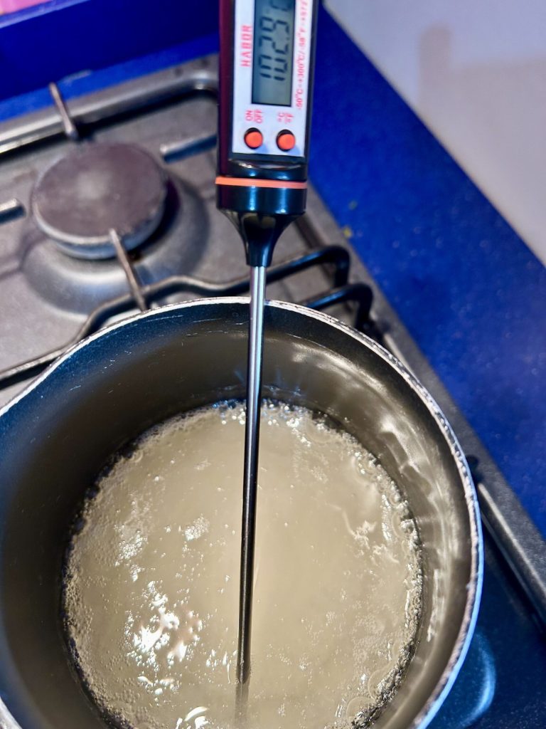 Introduce el termómetro en el cazo mientras está al fuego y lleva el jarabe a 121°. Mientras tanto, comienza a verter las claras en el recipiente de la batidora de pie porque poco antes de que el azúcar alcance la temperatura te conviene comenzar a montarlas. Para quien no tenga termómetro, la temperatura adecuada para apagar el jarabe es cuando forma muchas burbujas de ebullición pero aún no se oscurece.