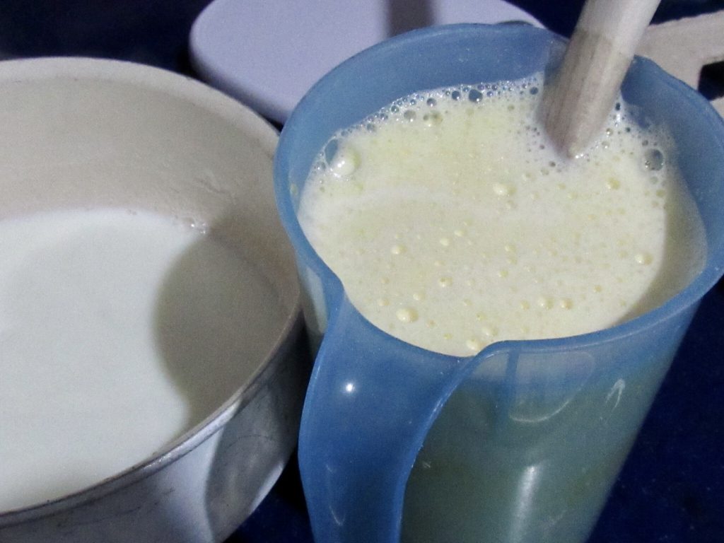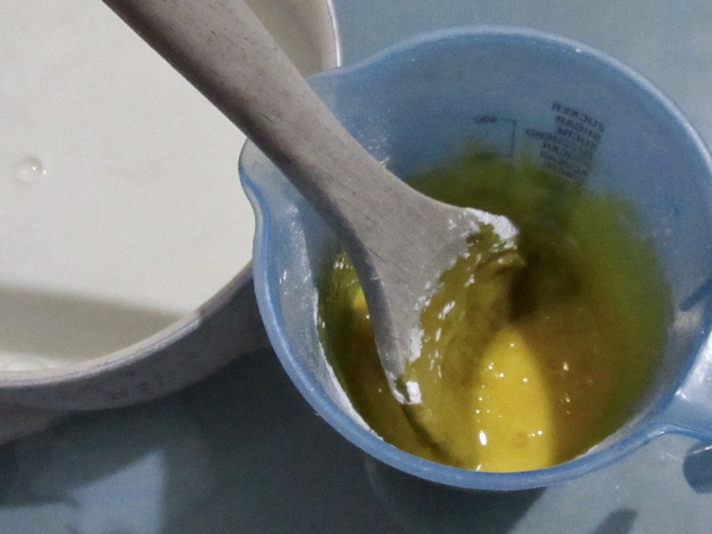 • Cuando la leche está a punto de hervir, quítala del fuego y con ella diluye, siempre mezclando a mano con el cucharón, las yemas. Cuando las yemas estén bien diluidas, ponlas de nuevo en el cazo y lleva todo de nuevo al fuego pero solo por unos minutos. Cuando la crema está en el fuego, debes siempre mezclar delicadamente con el cucharón, pero cuando la veas espesarse, apaga el fuego y sigue mezclándola con el fuego apagado, la verás espesarse y volverse aterciopelada.