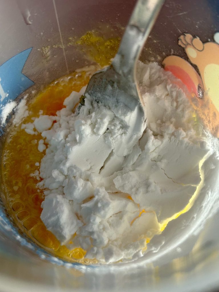 • En un bol rompe el huevo entero, añade el azúcar restante y el almidón de maíz (o fécula). Mezcla rápidamente con un tenedor, solo el tiempo necesario para obtener una mezcla homogénea.
