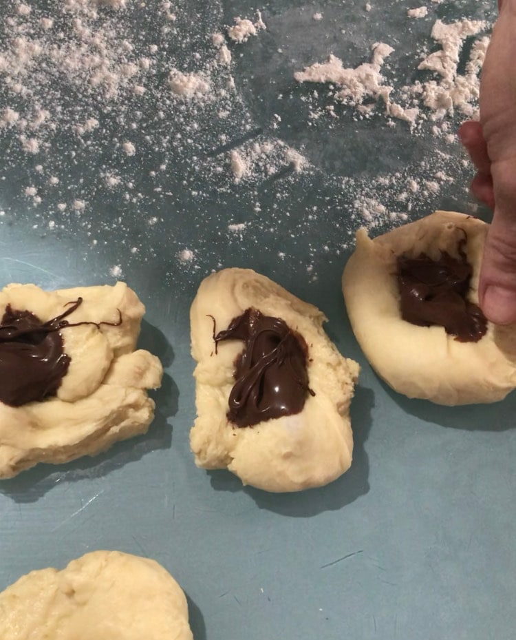 Rellene cada pieza de Danubio con una cucharadita aproximadamente de Nutella y enróllala en bolita con movimientos rotatorios sobre la mesa, realiza lo que se llama «pirlatura»