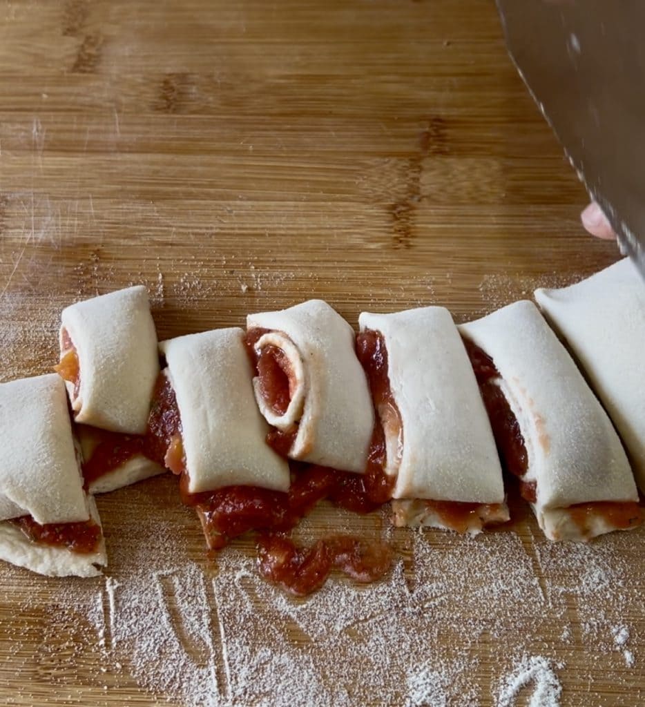 • Con la ayuda de una rasqueta o un cuchillo bien afilado, corta el rollo en espirales, procurando que todas sean del mismo tamaño. Luego, colócalas directamente en la canasta de la freidora de aire, sin usar bandejas ni papel de horno. Cocina las espirales a 180°C durante 15 minutos, hasta que estén doradas y crujientes.