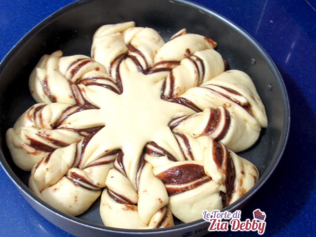 Si quieres obtener una flor de Nutella más bonita y precisa te sugiero, como hice la última vez, colocarla en un molde redondo para fermentar y cocer, así tendrás un borde que delimita bien. Yo utilicé un molde de 32 cm de diámetro. Esta foto es antes de la segunda fermentación.