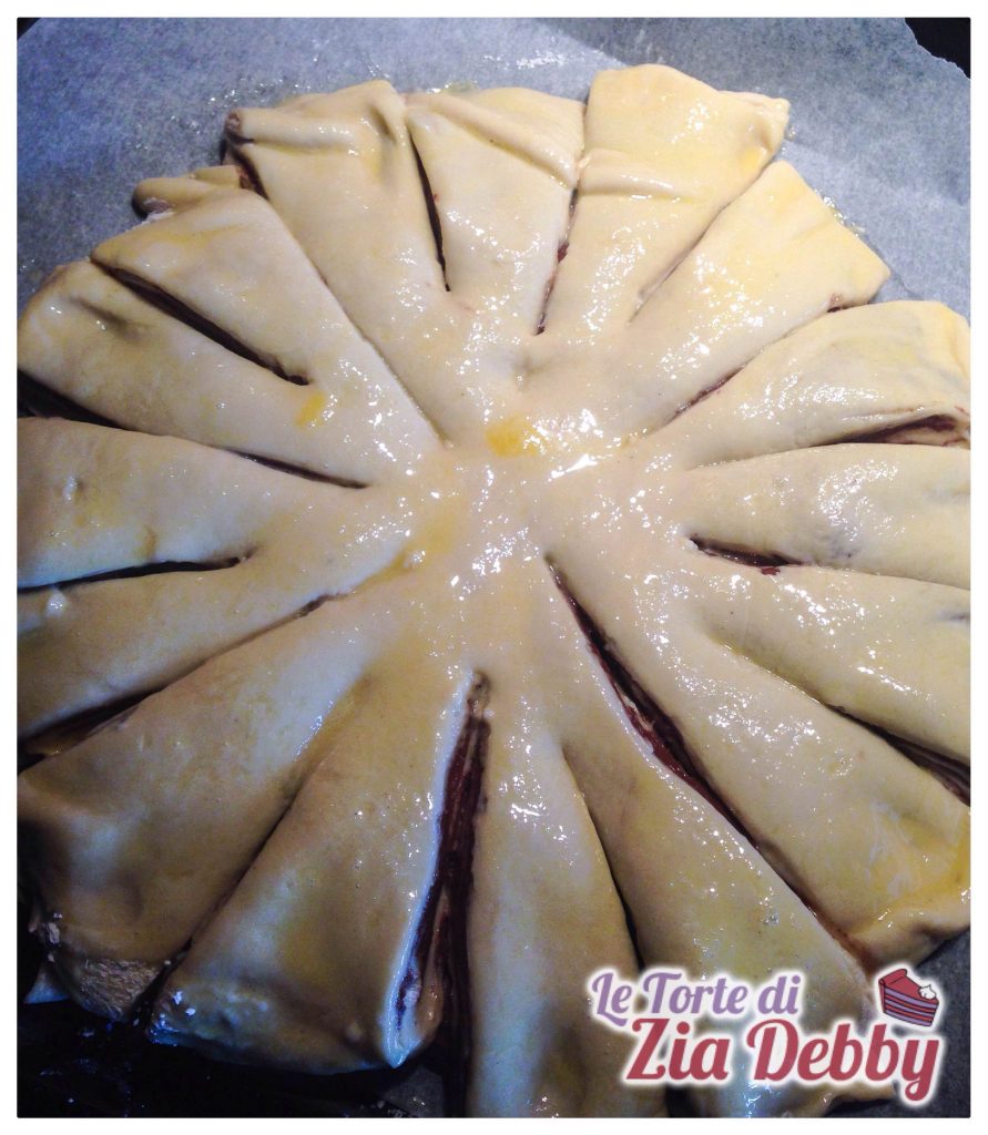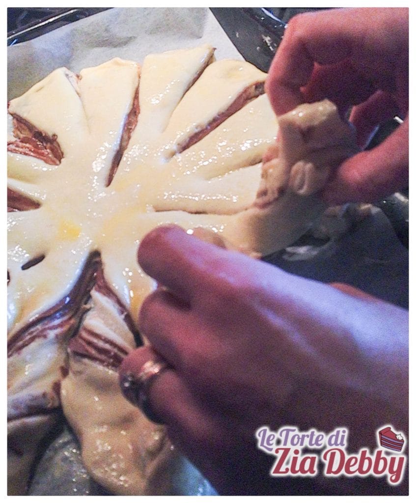 Ahora toma tu flor de Nutella y con la ayuda de unas tijeras córtala en varios pétalos comenzando por cuatro cortes y decide luego cuantos pétalos quieres realizar, los cortes no deben llegar nunca al centro de tu flor, sino detenerse al menos 5 cm antes. Cada ‘pétalo’ deberá dividirse aún más por la mitad para poder enrollarlo sobre sí mismo. Espero que la foto sea explicativa, de lo contrario no dudes en preguntar.