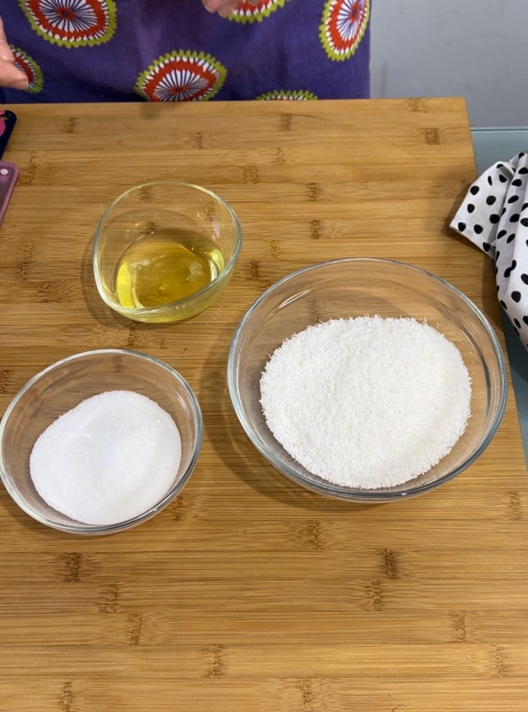 Preparad los ingredientes que vais a utilizar: harina de coco, azúcar y claras de huevo. Empezad a encender el horno porque la preparación de las galletas requerirá poco tiempo.